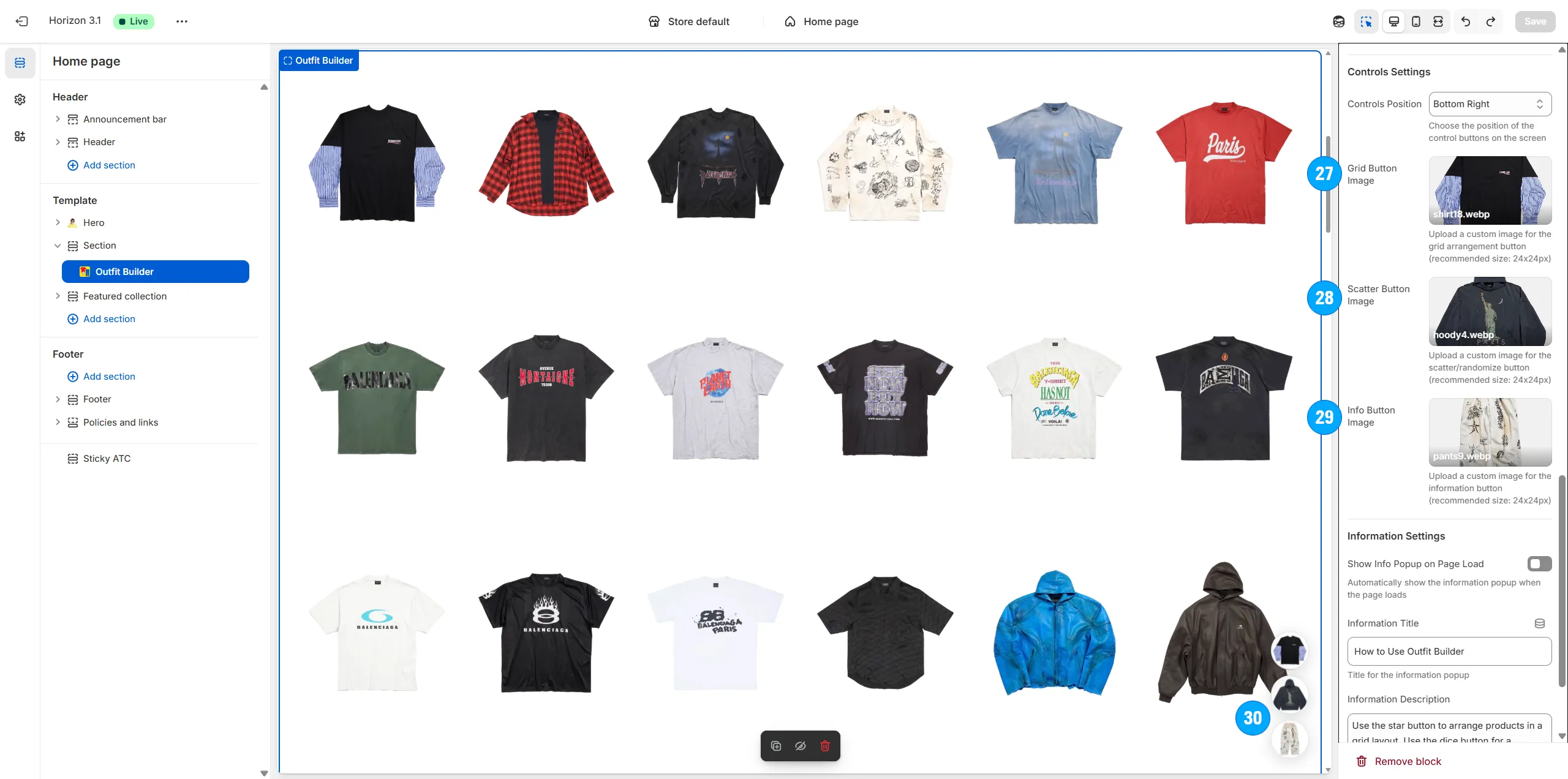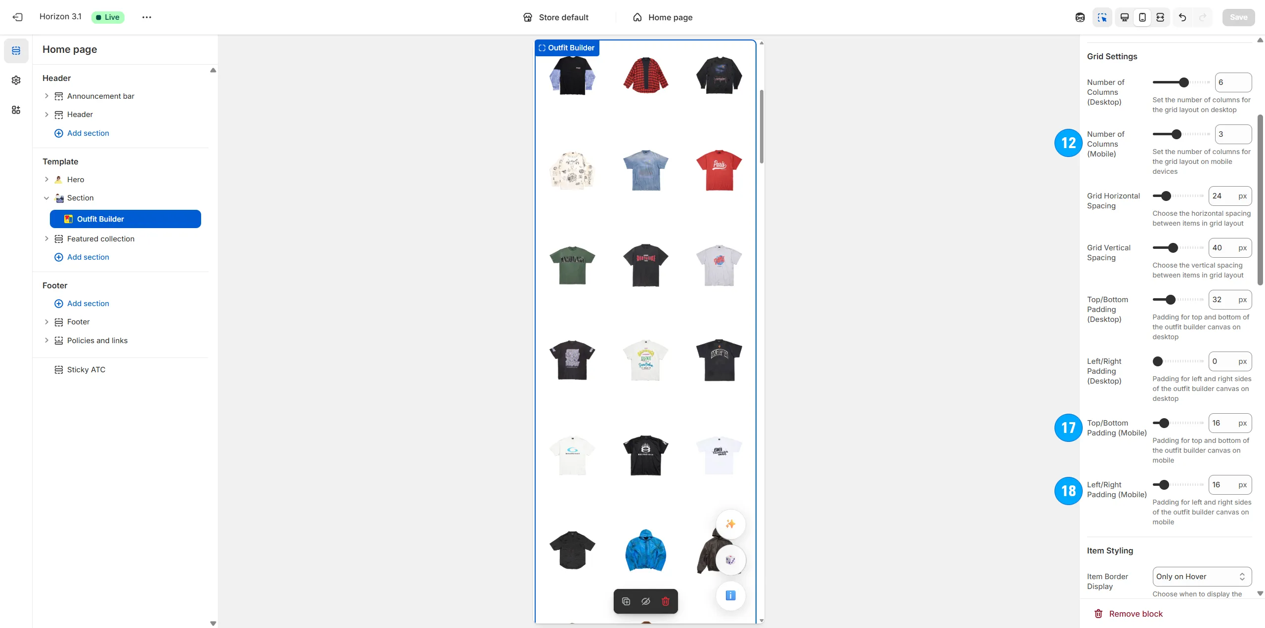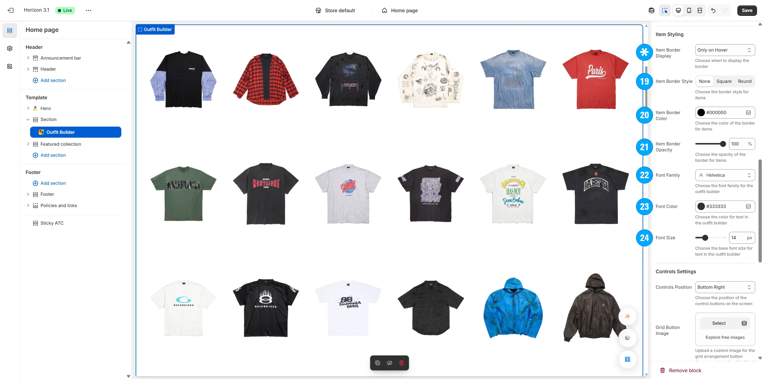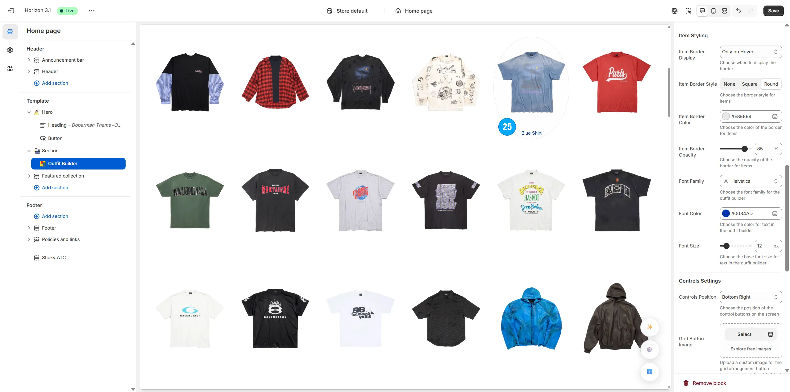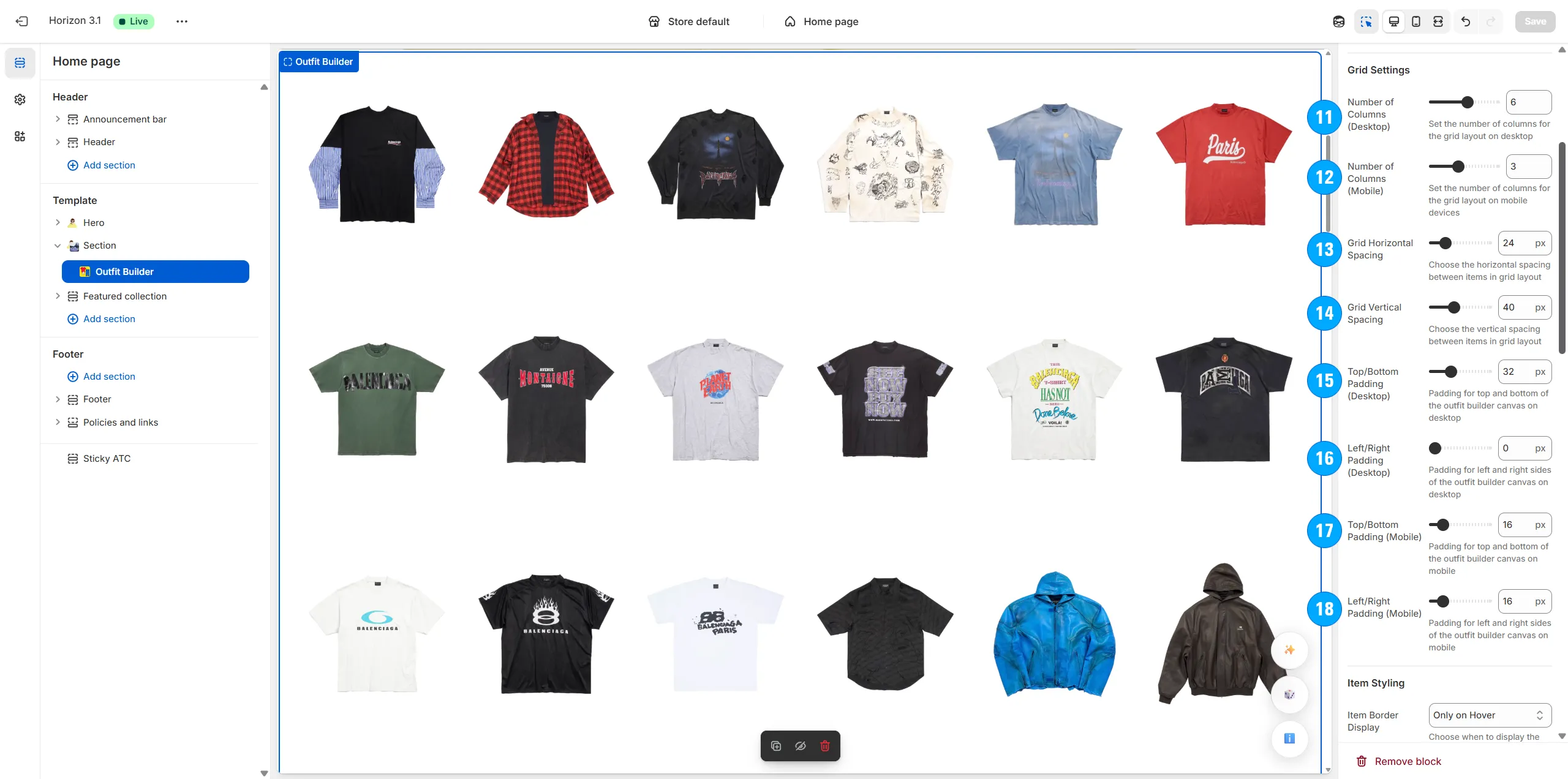 Arrange the type, amount and specific positioning of items on the page (including shirts, pants, shoes, hats, and even odd items like masks, weapons, food, armor, etc).
