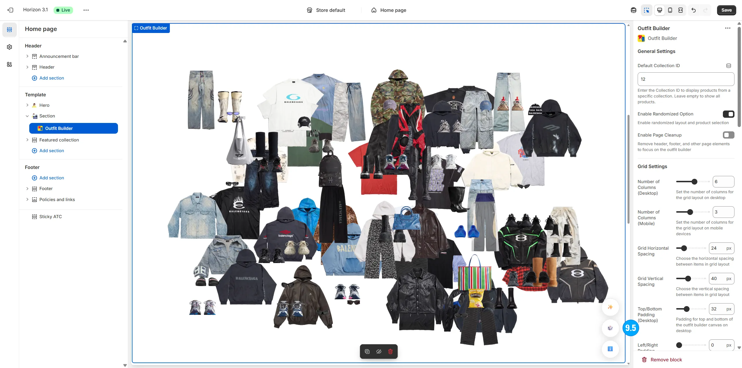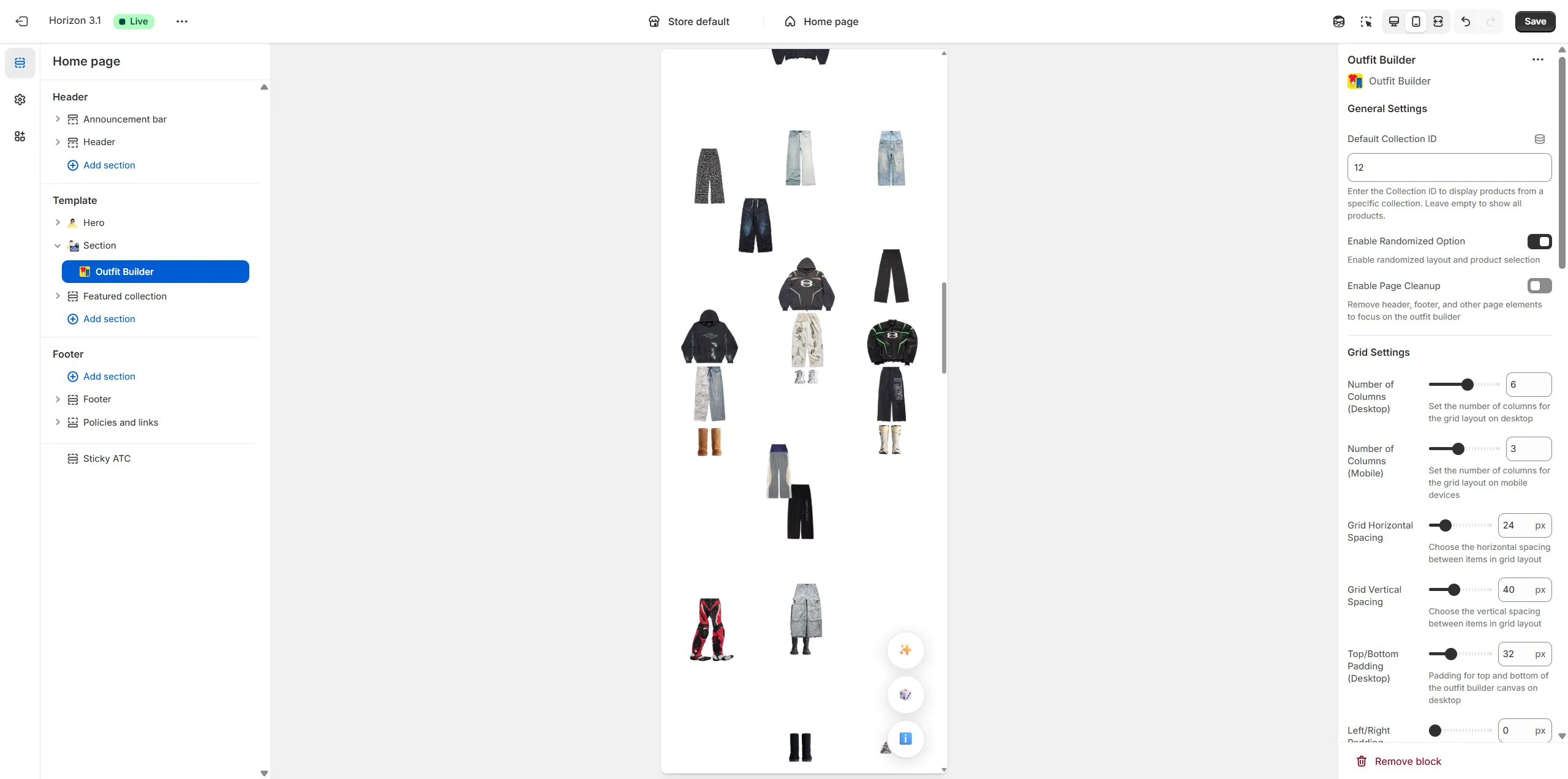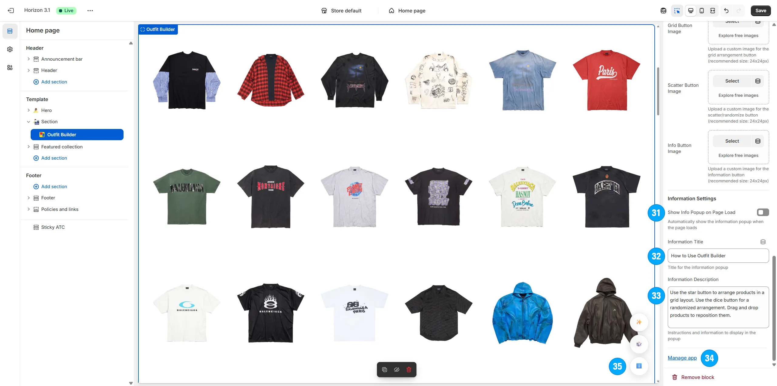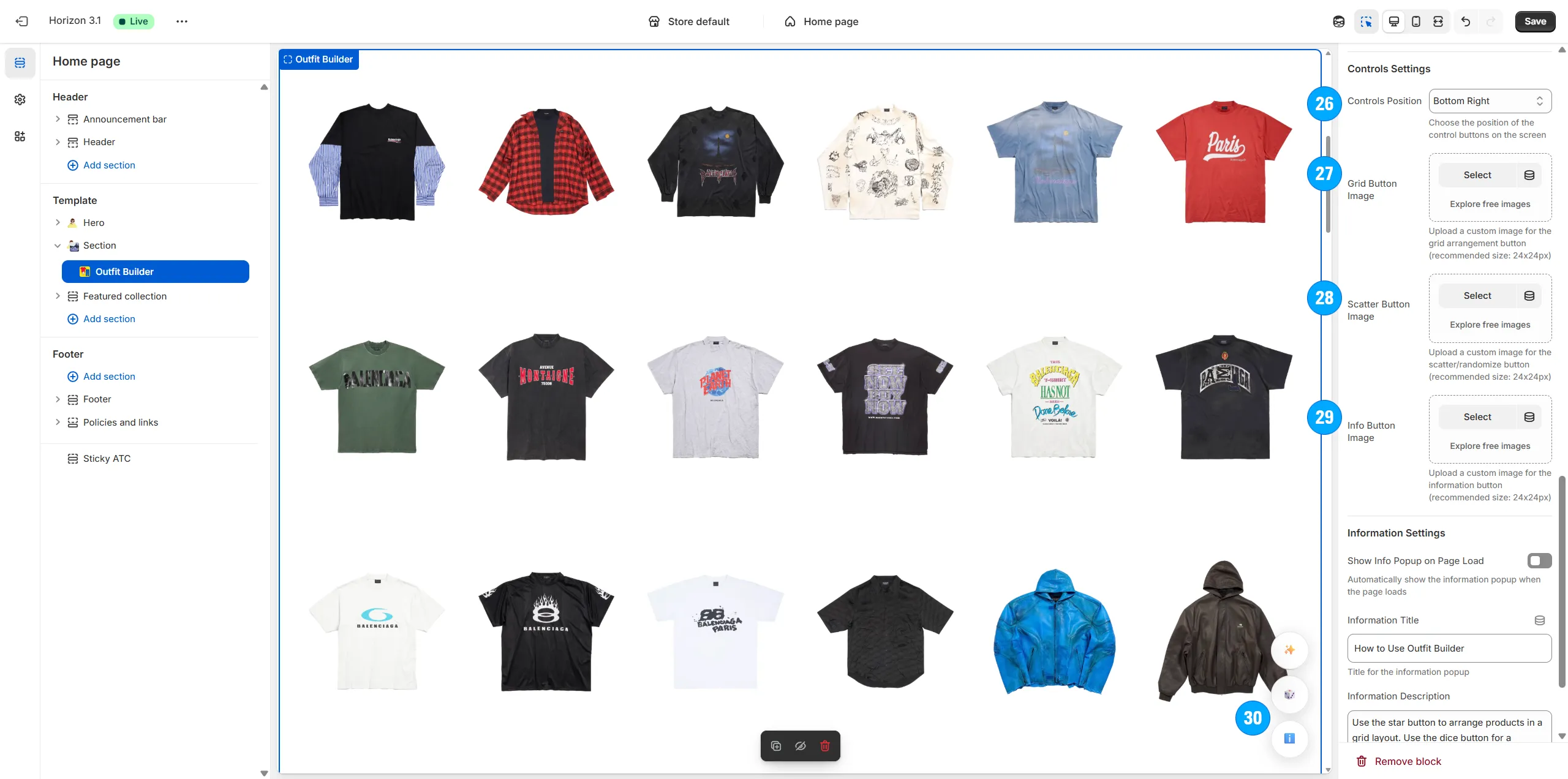 Arrange the type, amount and specific positioning of items on the page (including shirts, pants, shoes, hats, and even odd items like masks, weapons, food, armor, etc).